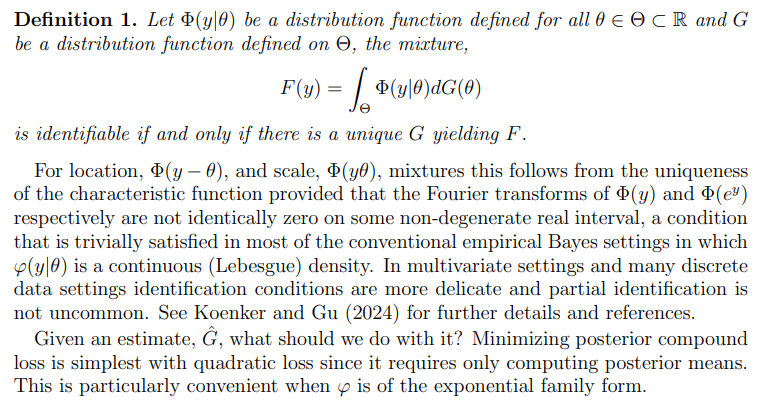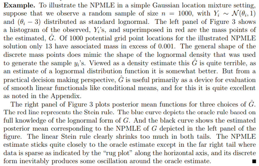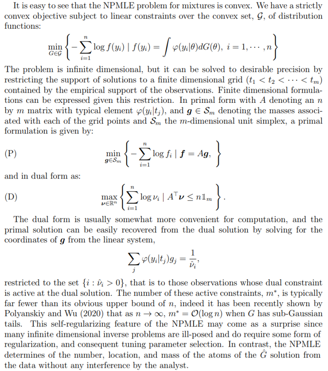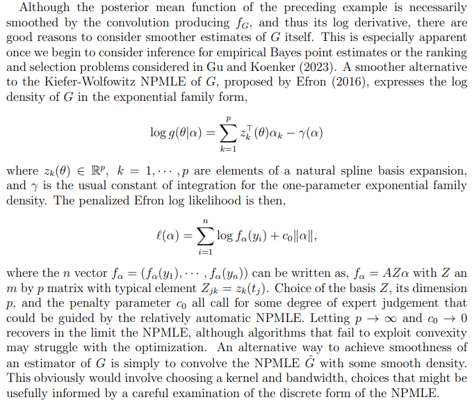 Parametric models for the prior, G, can be difficult to choose, so it is natural to ask whether some nonparametric procedure can be used to estimate G. An affirmative answer to this question can be traced back to an abstract of Robbins (1950), much more fully elaborated in Kiefer and Wolfowitz (1956). Some further development of the idea of nonparametric maximum likelihood estimation of mixture models was made by Pfanzagl (1988), but practical implementation of these methods was delayed until Laird (1978) showed how the nascent EM algorithm, Dempster et al (1977), could be used to compute it. Heckman and Singer (1984) pioneered the EM approach to explore the sensitivity to various parametric frailty models of duration models in econometrics. Lindsay (1981, 1995) further clarified many aspects of the NPMLE, but computation remained a bottleneck due to slow convergence of the EM algorithm. Fortunately, modern developments in convex optimization have substantially improved computational prospects for the NPMLE.